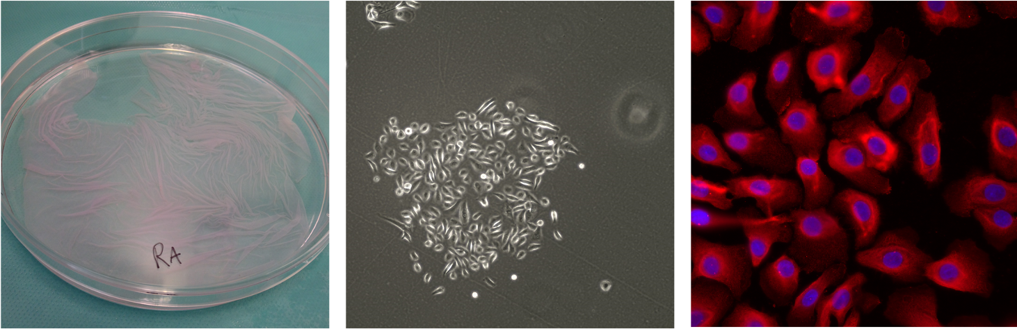 Amniotic membrane is separated from whole placental tissue followed enzymatic tissue digestion. After 7-10 days cultivation in serum-free cell culture medium, small colonies appear showing the typical epithelial morphology. These cells are enriched and stained for presence of typical marker proteins such as SSEA-4 (red fluorescence, DNA is counterstained with DAPI).