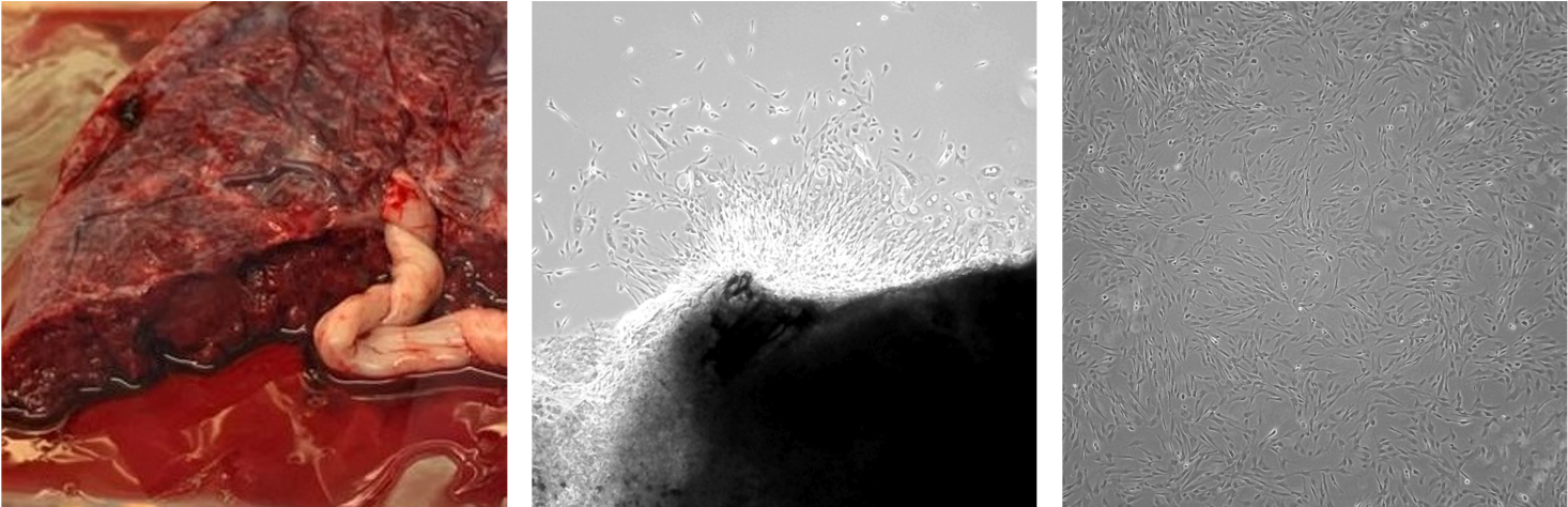 Chorionic plate region is prepared from whole placental tissue and cut into small pieces. The resulting fragments are seeded into culture plates for outgrowth of mesenchymal stem cells. These cells are enriched in vitro and show the typical spindle-shaped mesenchymal morphology.