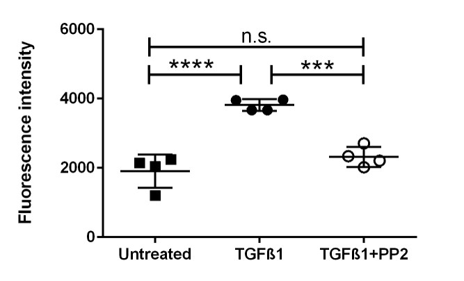 Treatment of telomerized human lung fibroblasts LF/TERT309 with transforming growth factor beta (TGF-ß) together with PP2, an inhibitor of Src familiy of tyrosine kinases, attenuates the response of the cells to TGF-ß.