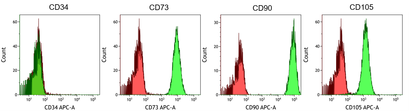 RA-MSC/TERT308 cells homogeneously express typical marker proteins of mesenchymal stem cells such as CD73, CD90 and CD105, whereas the hematopoietic stem cell marker CD34 is not expressed (green peaks). Cells stained with isotype control antibodies are used as negative control (red peaks).