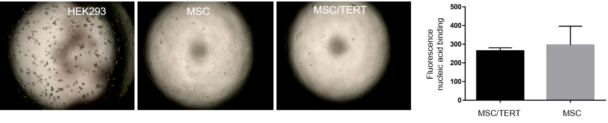 Cells are seeded at different densities into soft agar and cellular proliferation and colony formation is measured using a fluorescent, nucleic acid binding dye. Tumorigenic human embryonic kidney cells HEK293 are used as positive control for anchorage independent growth. Whereas, HEK293 cells form colonies in soft agar (left picture), telomerized mesenchymal stem cells (MSC/TERT) and the corresponding normal cells (MSC) do not proliferate when grown in soft agar and do not aquire a tumorigenic phenotype.