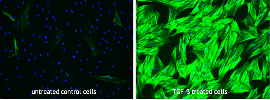 Treatment of skin fibroblasts fHDF/TERT166 cells with transforming growth factor ß (TGFß) induces expression of alpha smooth muscle actin (alpha SMA) as demonstrated by immunofluorescent staining (green: alpha SMA, blue: cell nuclei stained with DAPI). These data show the cells ability to differentiate towards myofibroblasts, which is a key event in physiological and pathological tissue repair.