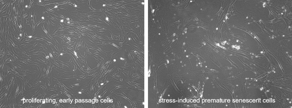 Normal human lung fibroblasts are treated with doxorubicin following established protocols to induce stress induced premature senescence (SIPS). Whereas normal, early passage, subconfluent cells are characterized by the typical spindle-shaped mesenchymal morphology, doxorubicin treated cells aquire the typical, flattened, multi-nucleated morphology of senescent cells.